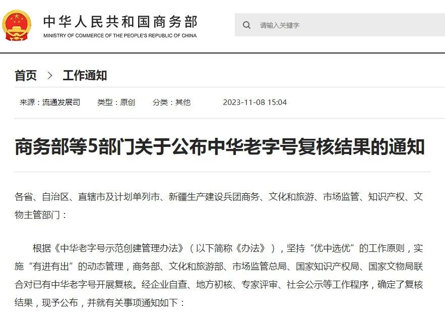 商务部等5部门关于公布中华老字号复核结果的通知