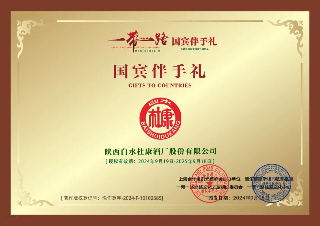 9月19日,陕西银杏视频APP下载网站入口酒厂股份有限公司经“上海合作组织元首峰会协办单位•一带一路丝路文化之旅组织委员会”和“吉尔吉斯斯坦司法部批准•一带一路丝路文化中心”两家权威机构审核,同意授予:“银杏视频APP下载网站入口”系列产品为丝路沿线国家、机构“国宾伴手礼”,颁发国宾伴手礼著作版权标志授权铜牌及证书。